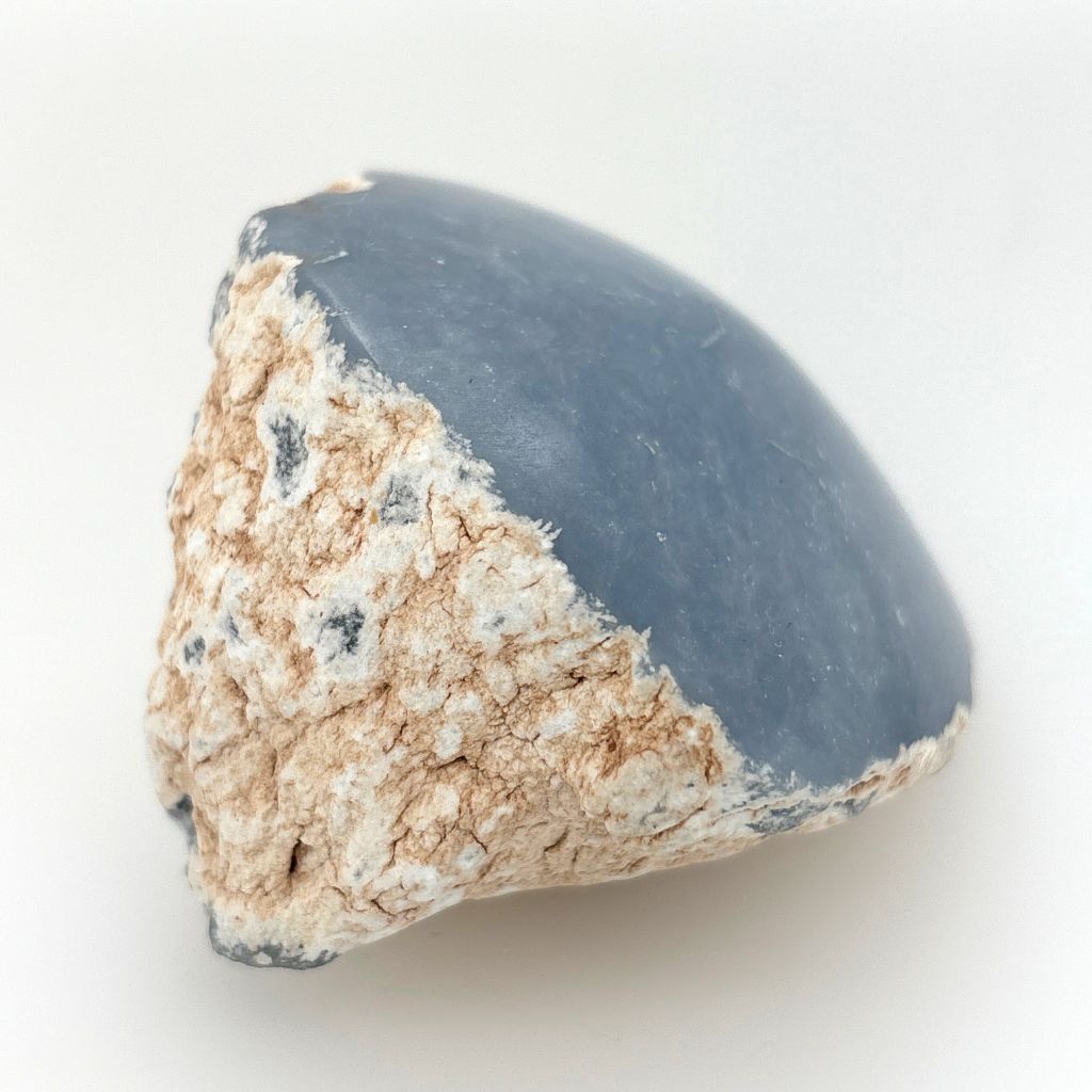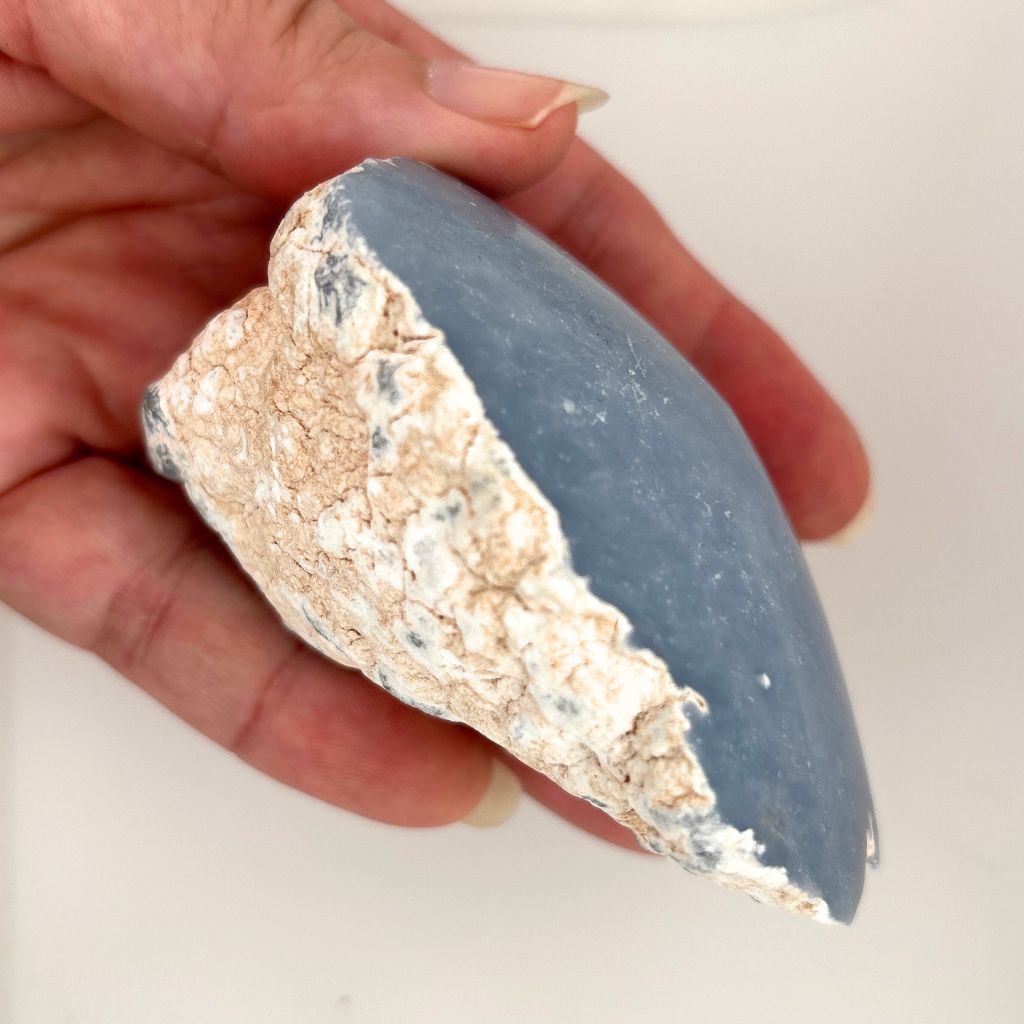 This beautiful Angelite crystal features one smooth, polished face that reveals the soft, calming blue tones of the stone, while the remaining sides are left natural, showcasing its raw, earthy texture. This contrast highlights Angelite’s gentle energy and makes each piece feel beautifully unique.