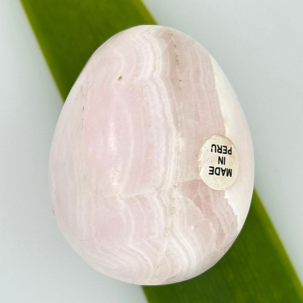 This beautiful Pink Mangano Calcite crystal egg displays soft blush pink tones with gentle natural banding and subtle white patterns that highlight the delicate beauty of this calming stone. The smooth polished egg shape fits comfortably in the hand, making it perfect for meditation, energy work, or simply as a soothing crystal to hold.