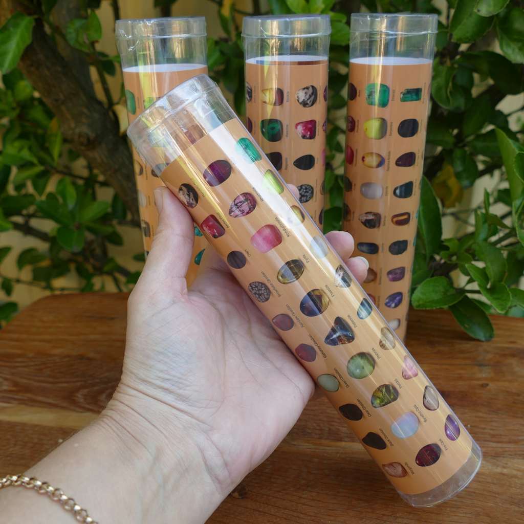 Agates, Amazonite, Amethyst, Angelite, Aventurine, Carnelian, Clear Quartz, Calcite, Fluorite, Mookaite, River Red Carnelian, Gold Tiger Eye, Red Tiger Eye, Goldstone, Green Quartz, Rock Quartz, Rose Quartz, Hematite, Moonstone, Red Jasper, Snowflake Obsidian, Selenite, Citrine, Sodalite and many more.