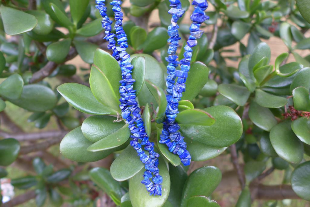 • Natural Lapis Lazuli chips: These necklaces are made from raw, rough Lapis Lazuli chips, showcasing the stone's deep blue colour with golden flecks of pyrite.