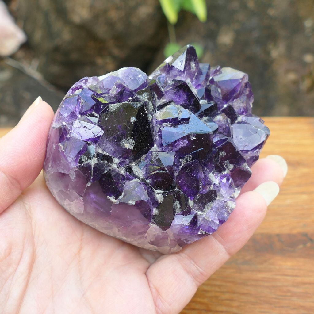 This stunning Amethyst Heart Cluster beautifully combines the calming energy of Amethyst with the symbolic shape of the heart. The piece features deep purple crystal points that sparkle from every angle, forming a natural cluster across the carved heart shape.