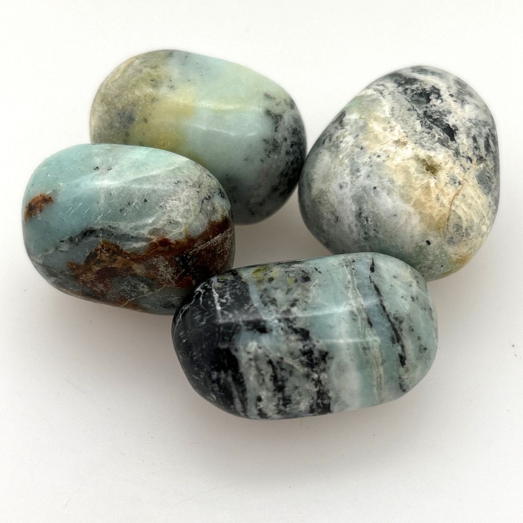 Beautiful Blue Opal Tumble Stones featuring soft ocean tones of pale aqua, misty blue, cream and earthy charcoal marbling. Each piece is uniquely patterned, with calming colours that feel like sea foam and coastal skies.