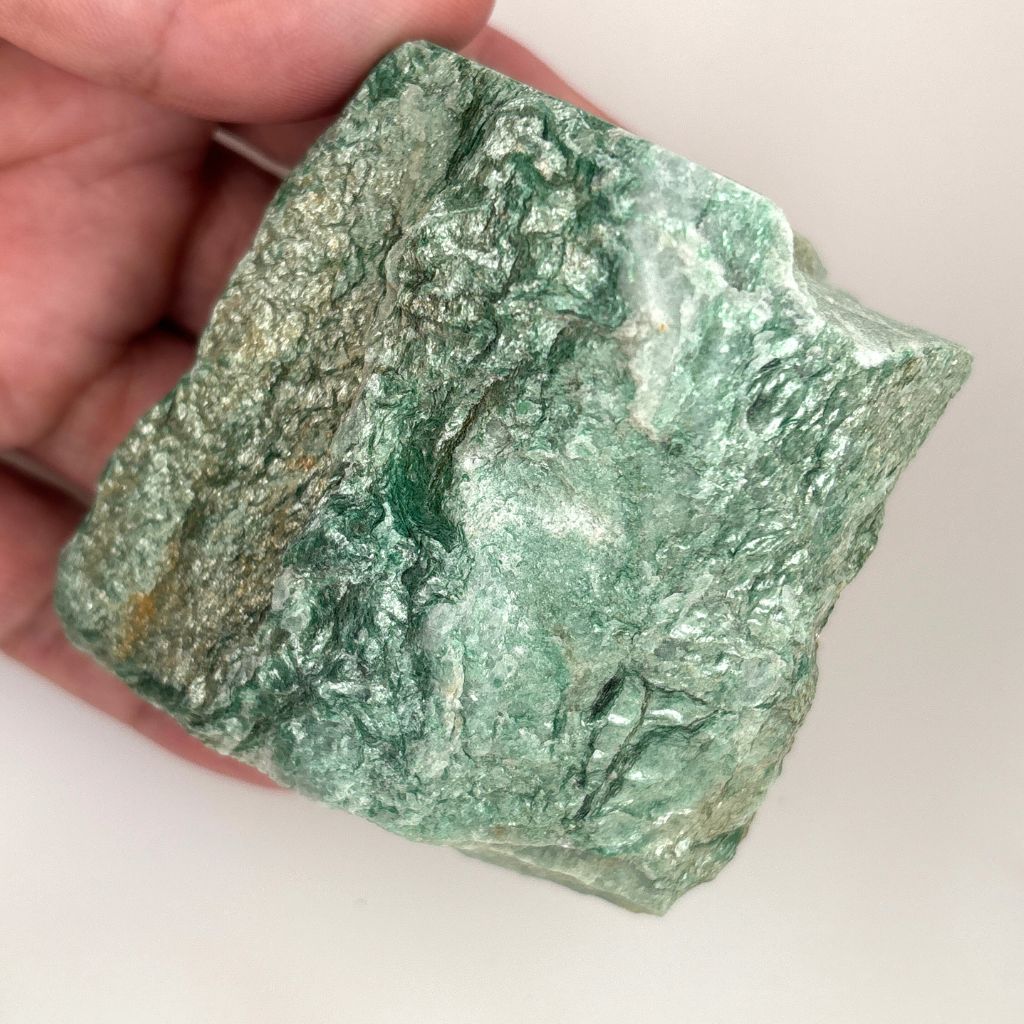 This beautiful natural Fuchsite specimen features soft to vibrant green tones with a subtle shimmering texture throughout. Its layered, slightly sparkly appearance comes from its mica content, giving the stone a gentle reflective sheen in the light.