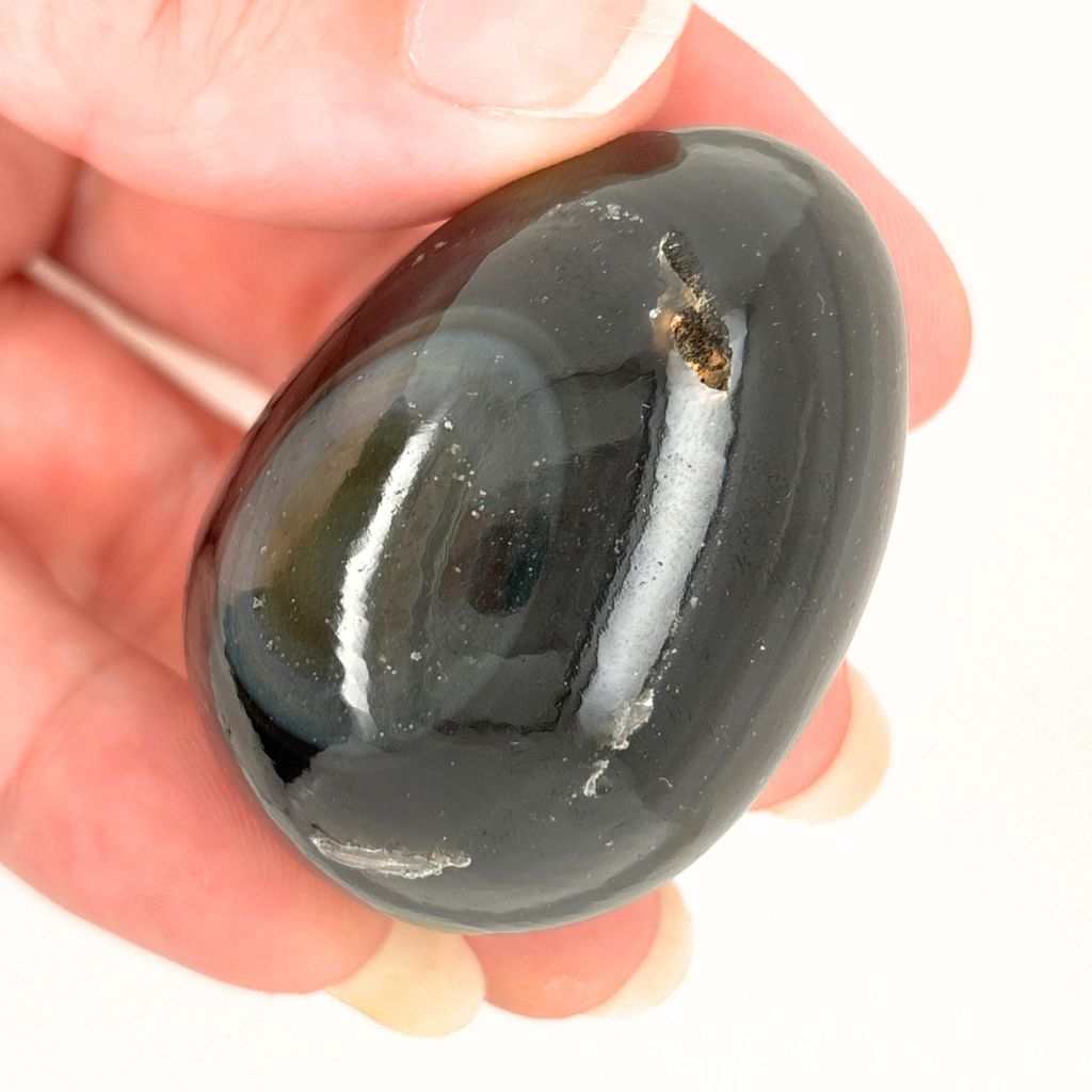 This stunning Rainbow Obsidian Egg is a powerful and protective crystal, polished to a smooth, glossy finish that reveals its subtle hidden beauty. At first glance it appears deep black, but when the light catches it just right, soft circular bands of grey, green and rainbow sheen emerge from within — a magical reminder that there is always light beneath the surface.