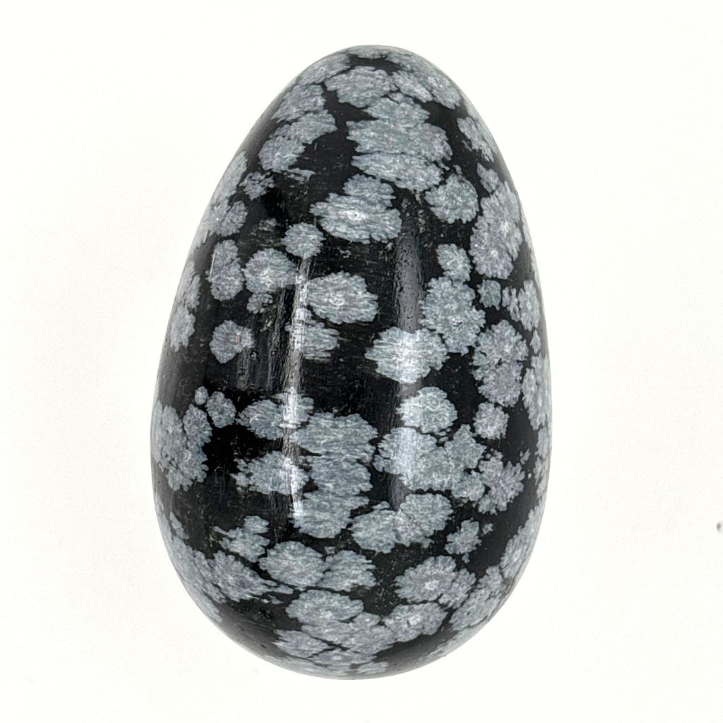 This striking Snowflake Obsidian Crystal Egg features beautiful natural patterns of soft grey “snowflakes” scattered across a deep black background. These unique markings are formed from natural mineral inclusions, creating the distinctive snowflake-like patterns that make each piece truly one of a kind.